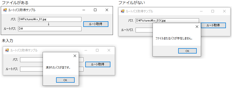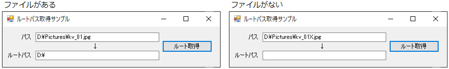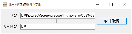 ルートパスを取得するだけであればSystem.IO.Path.GetPathRoot関数だけでいいのですが、もし存在チェックや空文字チェックを行った後にルートパスを取得するようにしたい場合など、別の処理を追加するとなった時に修正箇所が多いと大変です。そのためあらかじめ関数化しておいて修正する箇所は少なくなるようにしましょう。