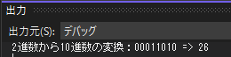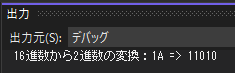 Console.WriteLine($"16進数から2進数の変換:{ hex } => { bit }");