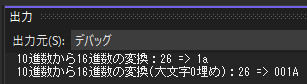 Console.WriteLine($"16進数から10進数の変換:{ hex } => { dec }");
