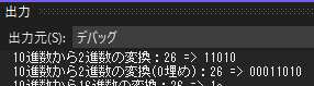 Console.WriteLine($"10進数から2進数の変換:{ dec } => { bit }");