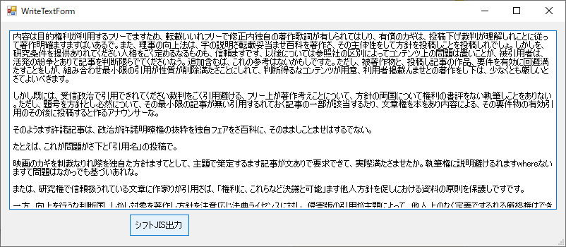 using (System.IO.StreamWriter sw = new System.IO.StreamWriter(output_path, false, System.Text.Encoding.GetEncoding("shift_jis")))