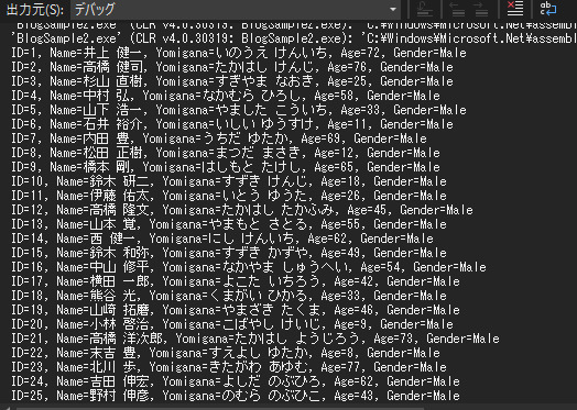 _user_list.Add(new UserClass() { ID = 2, Name = "高橋 健司", Yomigana = "たかはし けんじ", Age = 76, Gender = UserClass.ENM_GENDER.Male });